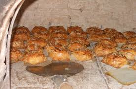 After that, to make the glaz, place the sesame seeds, vinegar and enough water to cover in a small saucepan and bring to boil. To assemble, divide dough into large pieces and roll out on a floured work surface until about 5 mm thick. Using a saucer as a template, cut into 22 cm rounds.Preheat the oven to 200°C.Line baking trays with baking paper. Firmly press one side of pastry rounds into sesame seeds on tea towel to coat bases well. Place 2 tbsp of filling into centre and fold in three sides to make a rounded triangle shape, leaving a gap in centre with filling exposed. THATS ALL Good appetite!!!!!!